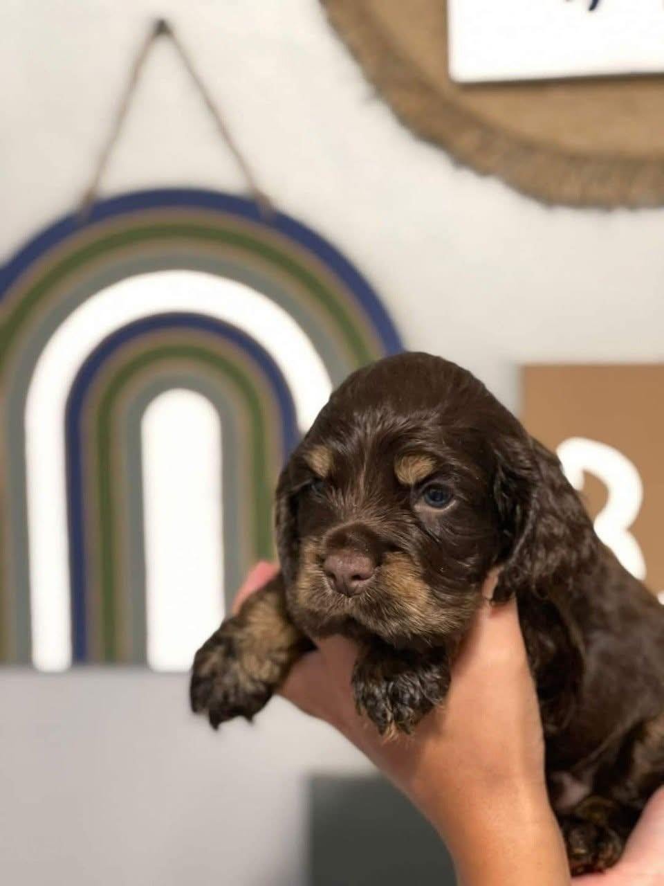 Meet Brontë, a rare chocolate and tan Cocker Spaniel with a soft, velvety coat and bright, curious eyes. Brontë is a gentle sweetheart who loves cuddles and quiet playtime. She enjoys being held, follows people around the room, and has a calm, affectionate nature that makes her perfect for families or first-time pet owners. Her charming personality and loving spirit will fill any home with warmth and joy.